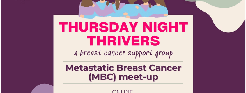 Our Thursday Night Thrivers MBC Meetup is a “no-agenda,” come-as-you-are opportunity for conversation, listening, support, maybe some crying, and hopefully some laughing. It is a private and inclusive space to meet others and ask questions. Whether you are recently diagnosed, had a recurrence or progression, or are one of the unicorns, our Thursday Night Thrivers MBC Meetup is for you! All are welcome!