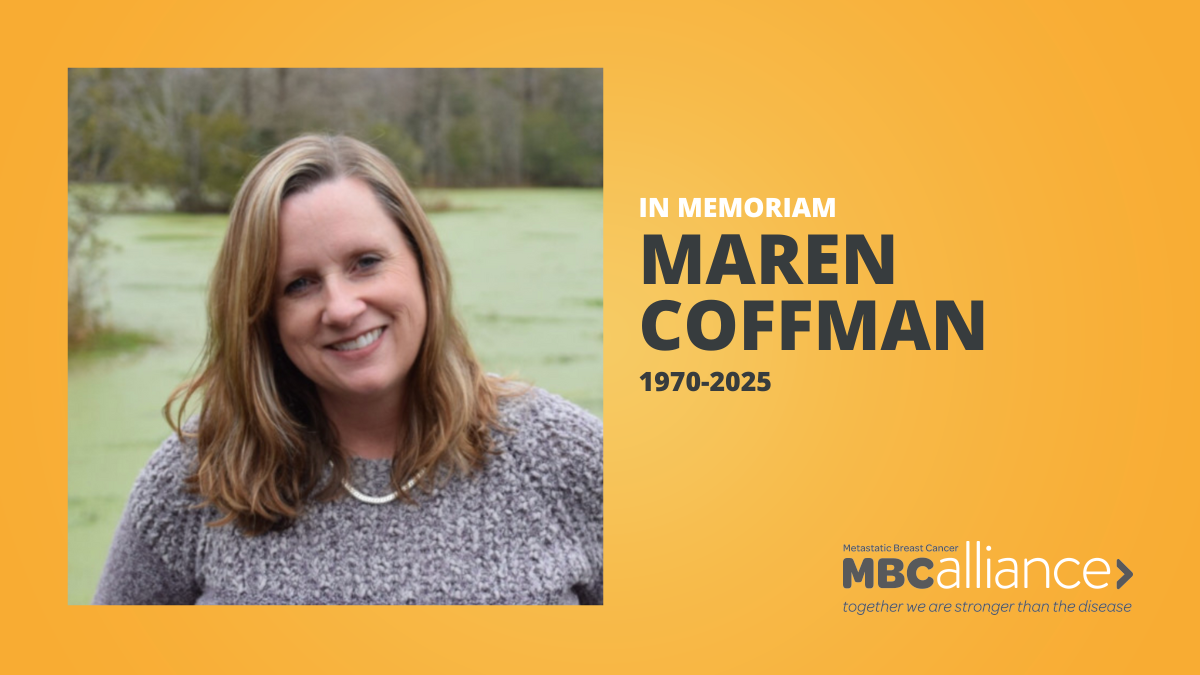 The Metastatic Breast Cancer Alliance honors the life and work of Maren Coffman, who passed away on September 29, 2025, shortly after joining the Alliance as a member. Though her time with us was far too brief, her work in patient advocacy had already made a meaningful difference for many of our nonprofit members. We are grateful for her generous commitment to the MBC community, and are privileged to share the story of her work and enduring legacy.