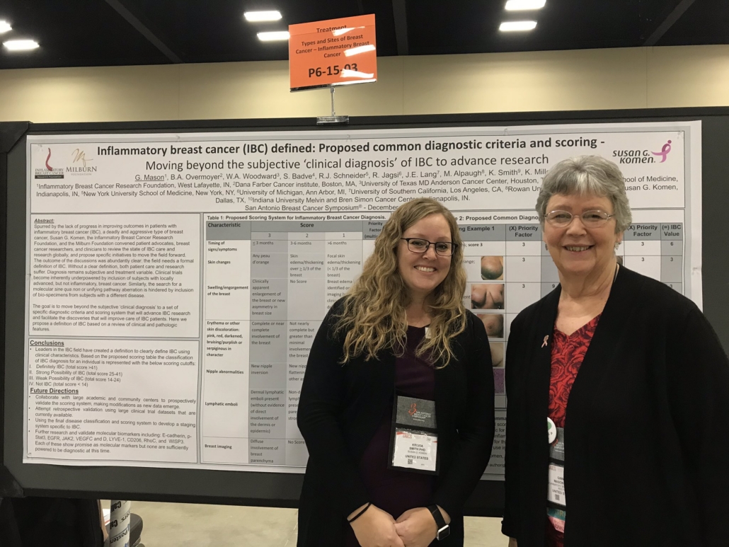 We’ve learned that collaborations can accomplish more so teamed with the Milburn Foundation and Susan G. Komen to bring together a group of clinicians, researchers, and advocates to tackle these topics. After a long day of discussions we settled on developing a diagnostic scoring system to aid healthcare professionals in the diagnosis of IBC. A white paper describing the scoring system was published then the scoring system was validated in a trial using IBC patient data. A diagnostic scoring system is now available in digital format on the Komen website for patient and healthcare provider use.