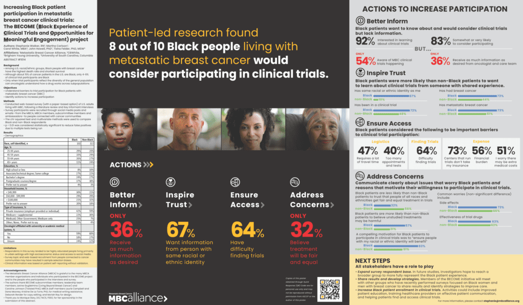 In 2019, epidemiologist and patient advocate, Marina Pomare Kaplan, presented a poster at SABCS on increasing participation in clinical trials: patient-driven solutions. Only 8.87% of survey respondents were Black, reflecting the current rate of Black clinical trial participation of about 6.2%.