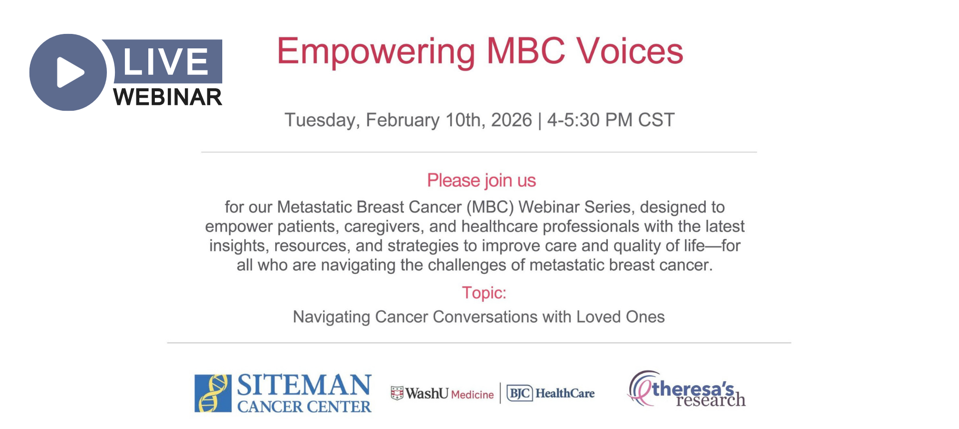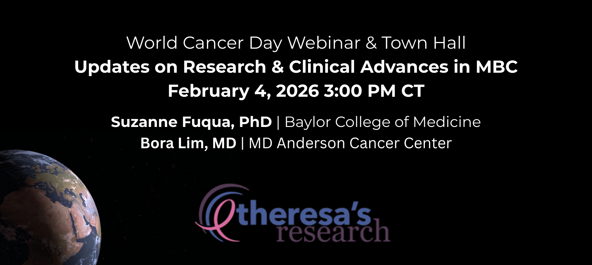 Join Theresa’s Research for a special World Cancer Day webinar focused on the latest breakthroughs in MBC. This session features expert insights from Suzanne Fuqua, PhD (Baylor College of Medicine) and Bora Lim, MD (MD Anderson Cancer Center) as they discuss current research updates and clinical advances. When: February 4, 2026 | 3:00 PM CT […]